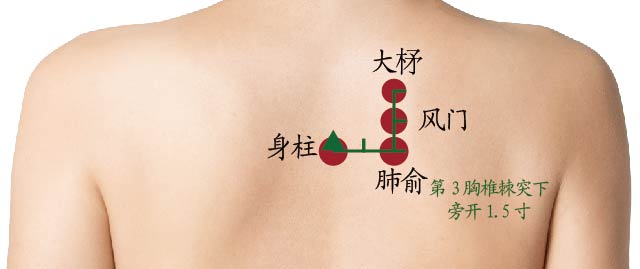 采用正坐,位于背部,当第2胸椎棘突下,旁开1.5寸。