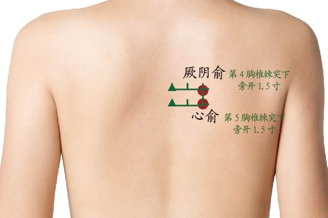 采用正坐,当第5胸椎棘突下,旁开两横指。