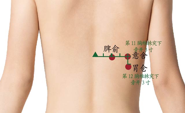 采用正坐,在背部,当第11胸椎棘突下,旁开3寸