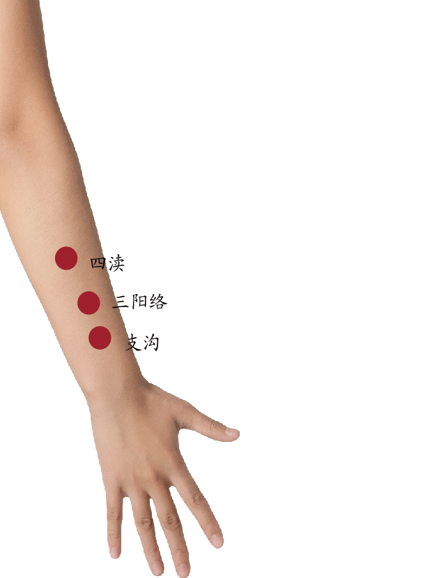 半屈肘俯掌,于手背腕横纹上7寸,尺、桡两骨之间取穴。