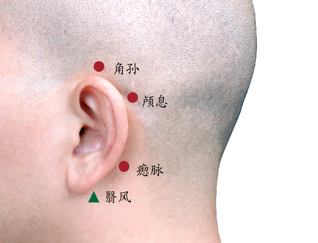 在耳后,当角孙穴至翳风穴之间,沿耳轮连线的上、中1/3的交点处。