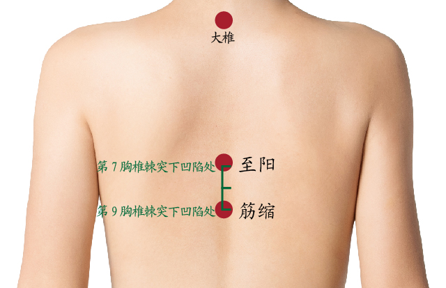 采用正坐,或者俯卧姿势,位于背部,在第9胸椎棘突下。