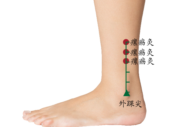 位于小腿腓侧远侧端,外踝尖(男左女右)正中直上2.5、3、3.5处,共计3穴.